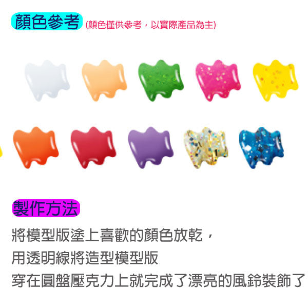 把喜歡的顏色塗上模型板的區框內放乾即可串出獨一無二的風鈴。