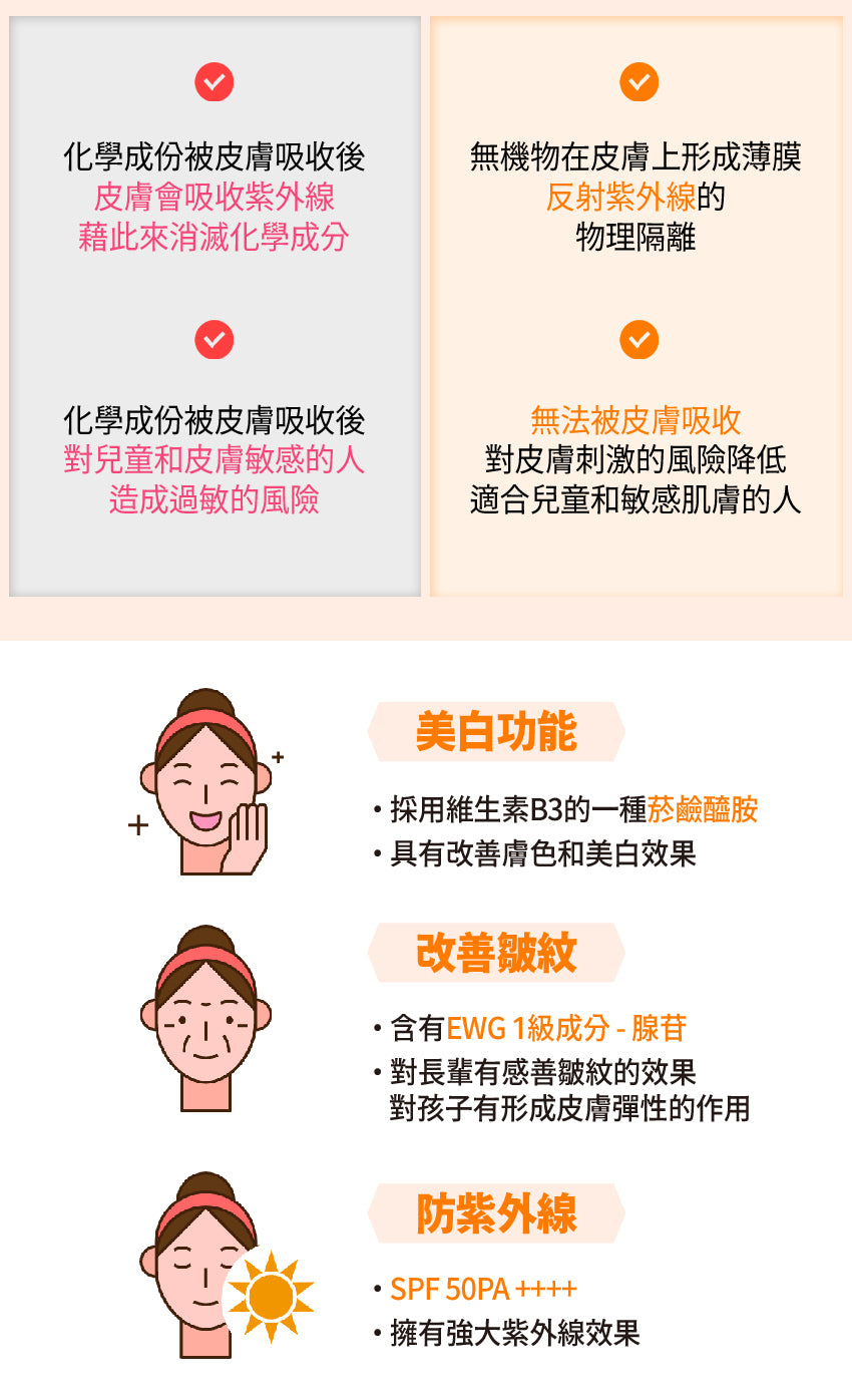-優質配方:使用無機物使其無法被皮膚吸收,因此對於皮膚刺激的風險降低,適合兒童和敏感肌膚的人。